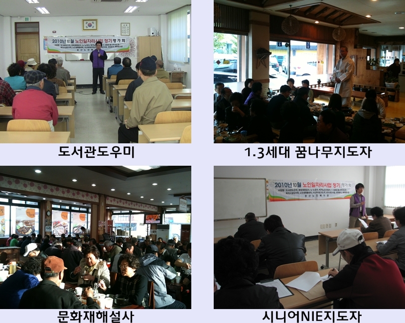 ■ 참여자 : 11개사업(도서관도우미, 1-3세대 꿈나무지도자, 노-노강사, 문화재해설사, 시니어NIE지도자, 희망둥지사업, 독거노인지킴이, 복지시설도우미, 주거개선사업, 노인생명돌보미, 해피홈사업) 참여어르신 384명