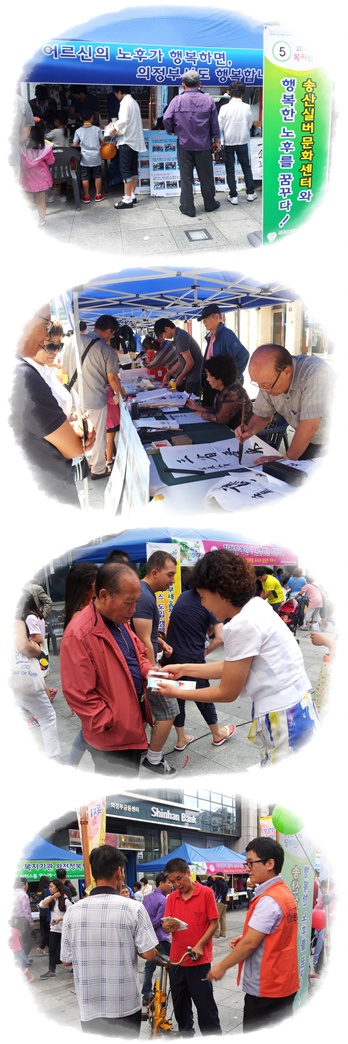 ■내 용 : 송산실버문화센터에서는 지난 10월 16일(토) 2012 의정부 복지한마당에 참여하여 지역주민을 대상으로 복지관 홍보 및 노인자살예방캠페인을 실시하였습니다. 또한 복지관 서예교실 참여어르신 4분을 모시고 지역주민에게 가훈을써드리는 부스를 마련하여 큰 호응을 얻기도 하였습니다.