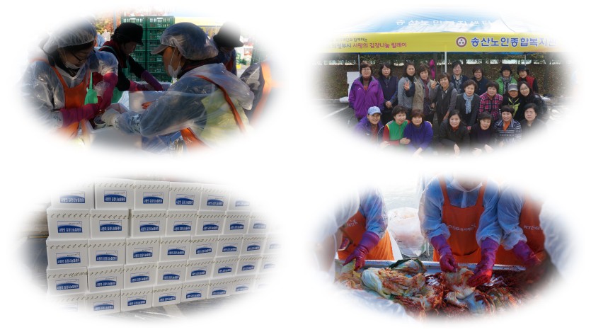 송산노인종합복지관은 11월 3일 북부청사 주차장에서 오전 9시부터 오후 3시까지 의정부 지역 8개 기관이 모여 ‘2015년 KT&G와 함께하는 김장릴레이 사업’을 실시하였고, 완성된 김장김치는 의정부지역 독거노인 대상자 200가정에 전달되었습니다.