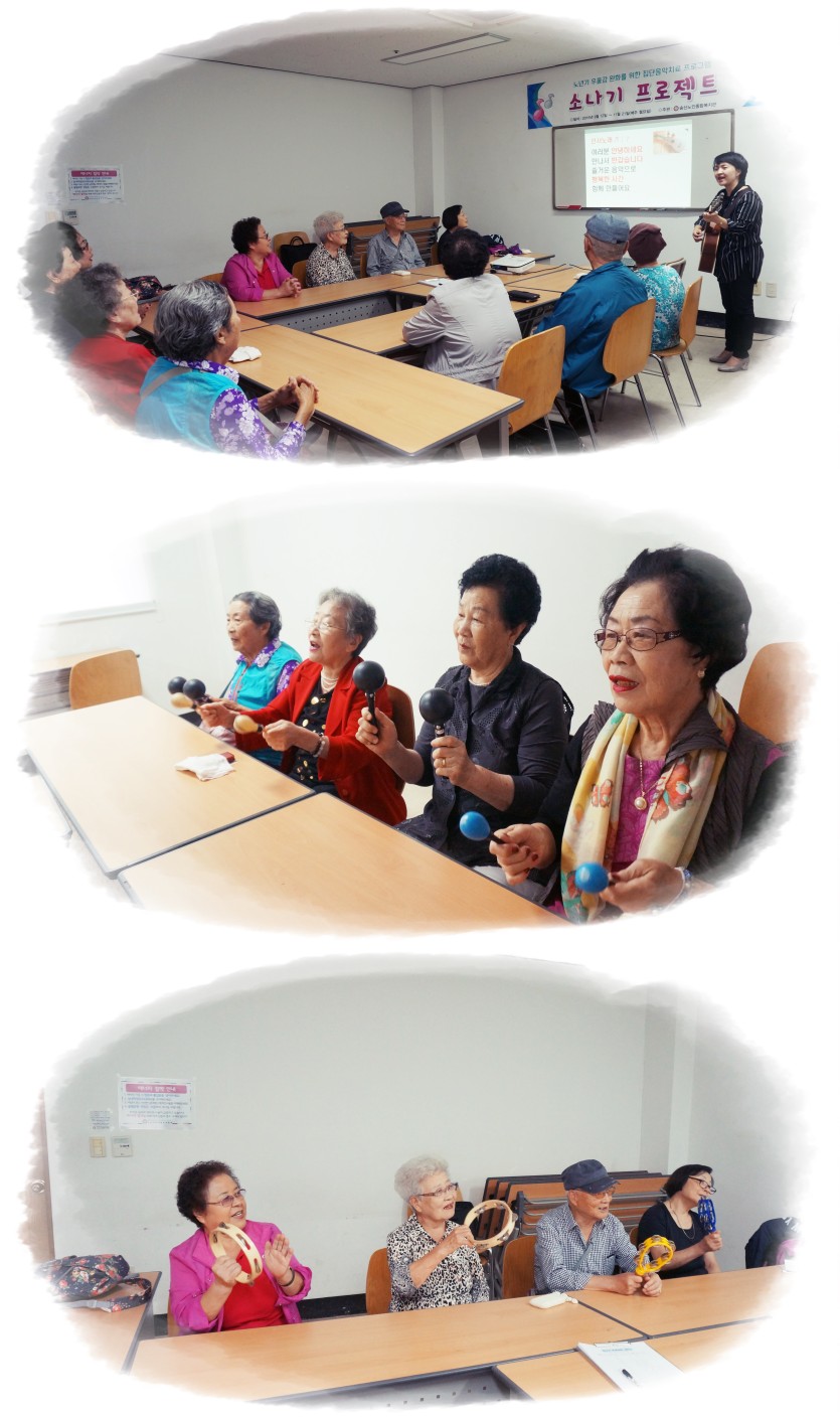 집단음악치료 프로그램을 통해 어르신들은 신나는 노래와 악기로 서로 소통함으로써 웃음꽃이 피어나는 모습을 살펴볼 수 있었습니다.