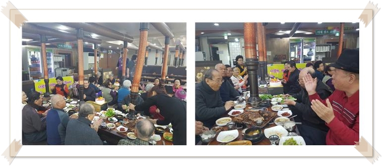 송산노인종합복지관에서는 정가네대박골(민락점), 유우승단팥빵집과 연계하여 11월 독거노인 생신잔치를 진행하였습니다. 이번 생신잔치는 만65세 이상 저소득 독거노인 21명을 대상으로 실시하였고 유우승단팥빵에서 생일케이크와 정가네대박골(민락점)에서 점심식사(돼지갈비) 및 장소를 각각 후원해주셨습니다.