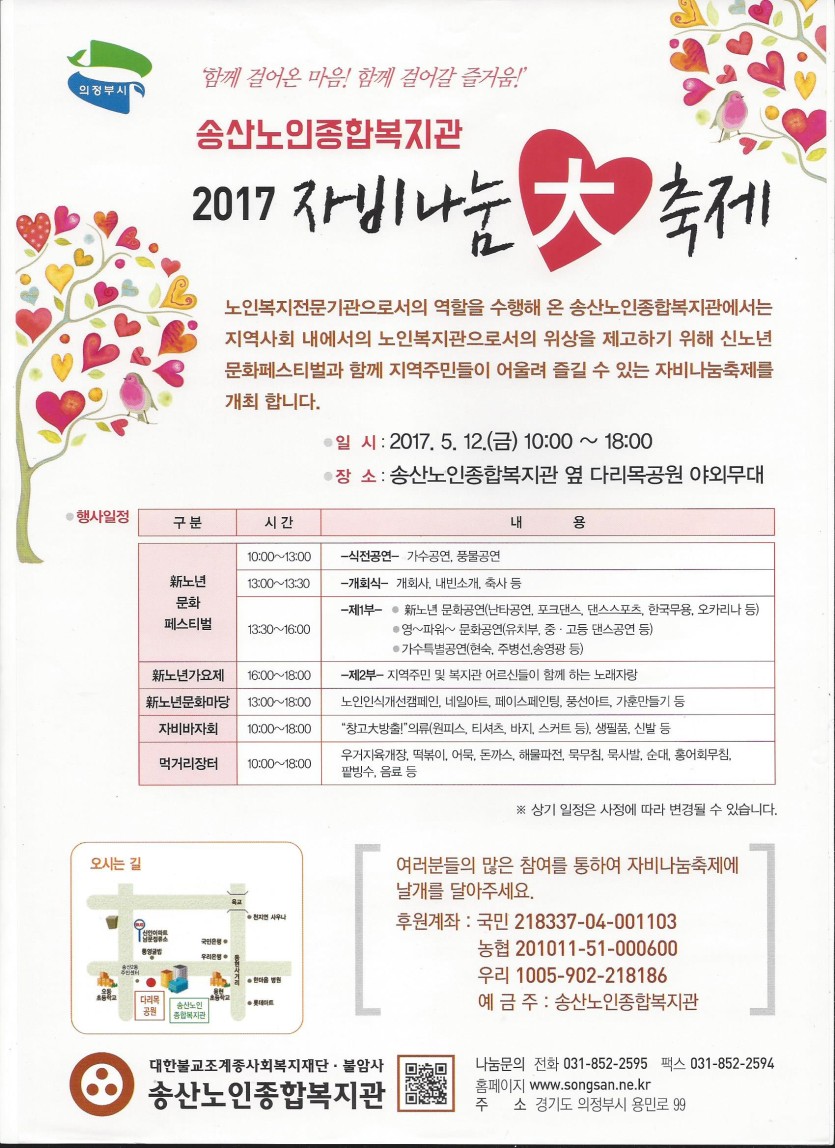 노인복지전문기관으로서의 역할을 수행해 온 송산노인종합복지관에서는 지역사회 내에서의 노인복지관으로서의 위상을 제고하기 위해 신노년문화페스티벌과 함께 지역주민들이 어울려 즐길 수 있는 자비나눔축제를 개최합니다.