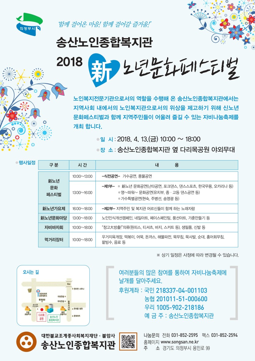 노인복지전문기관으로서의 역할을 수행해 온 송산노인종합복지관에서는 지역사회 내에서의 노인복지관으로서의 위상을 제고하기 위해 新노년문화운동 페스티벌과 함께 지역주민들이 어울려 즐길 수 있는 자비나눔축제를 개최합니다.