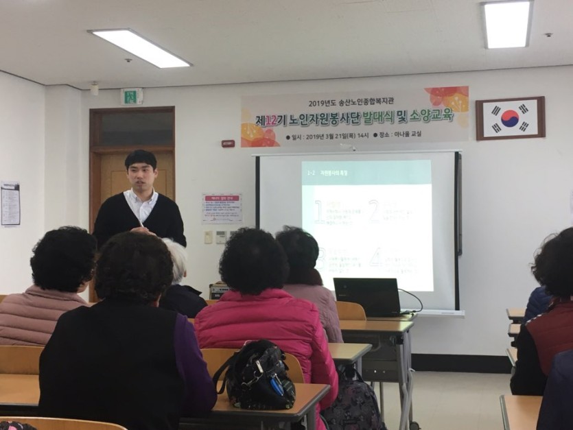 노인자원봉사단 어르신들 대상으로 발대식 후 기본소양교육을 실시함.