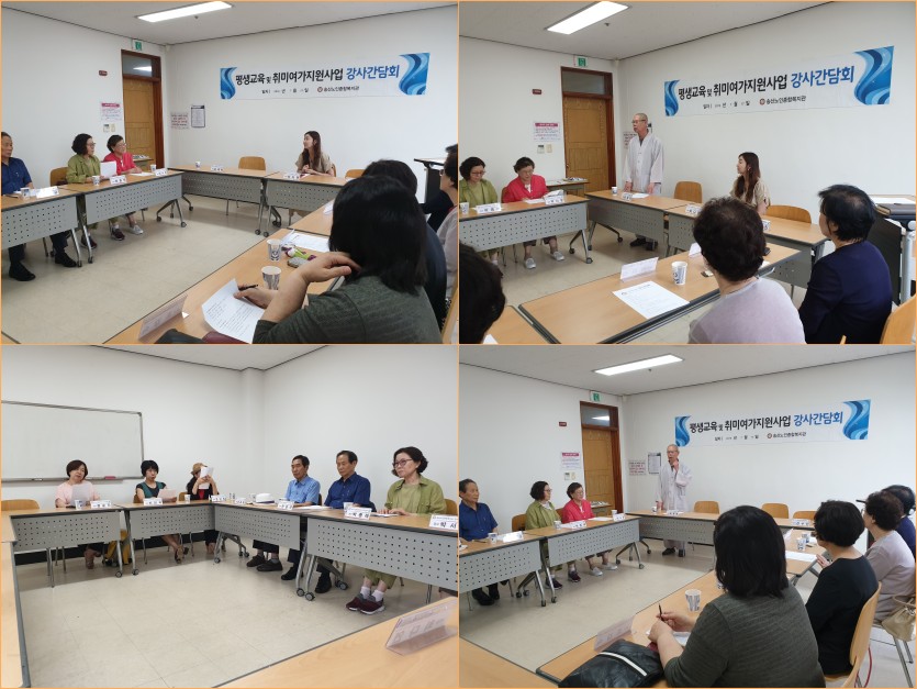 송산노인종합복지관은 평생교육 및 취미여가지원사업 강사님들을 모시고 상반기 강사간담회를 실시하였습니다. 이번 간담회는 강사님들의 의견을 수렴하여, 발전적이고 체계적인 평생교육 및 취미여가지원사업을 운영하기 위하여 마련된 자리로, 바쁜 시간에도 불구하고 많은 강사님들이 참석해주셨습니다.