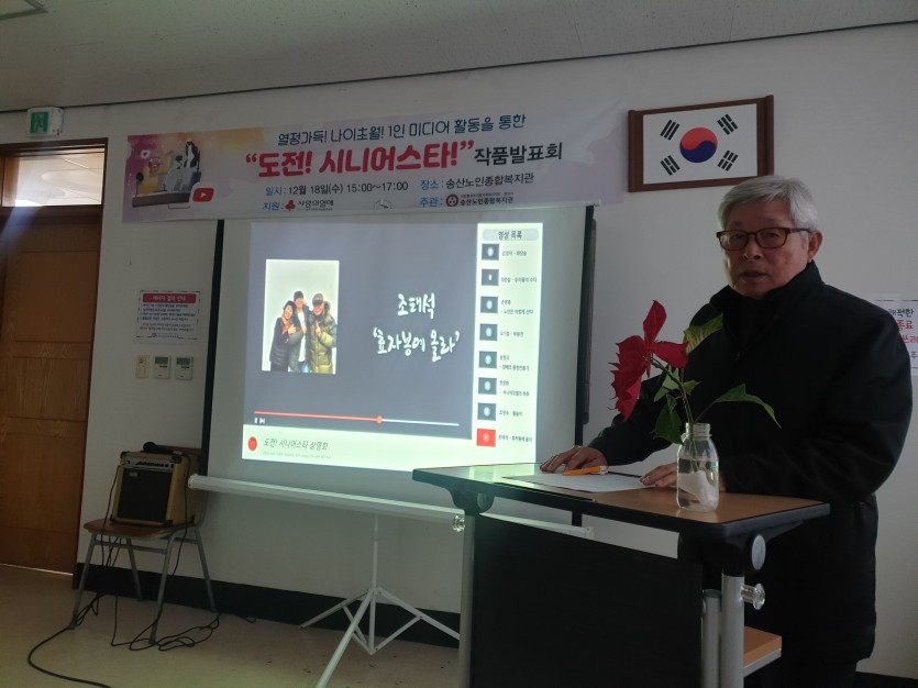 12월 18일 공동모금회 지원사업으로 진행되었던 열정가득! 나이초월! 1인 미디어활동을 통한 도전! 시니어스타 작품발표회를 실시하였습니다. 도전!시니어스타 사업은 1년동안 참여자 어르신에게 크리에이터 역량강화를 위한 교육, 유급자원봉사자와의 실습교육, 현장체험 등의 사업을 진행하였습니다. 총 8명의 어르신의 작품발표회를 진행하였으며, 어르신 모두 개인 유투브 채널을 개설하였습니다. 내년에도 진행될 도전!시니어스타 사업에 대한 많은 관심과 응원 부탁드립니다 ^^&