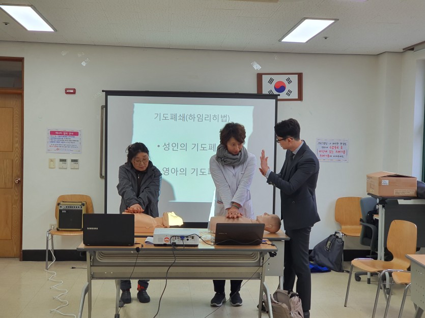전 직원들이 참석하였고 응급처치(동영상 위주), 기도가 막혔을 때, 심폐소생술, 자동제세동기 등 이론과 실습위주로 교육하였습니다.