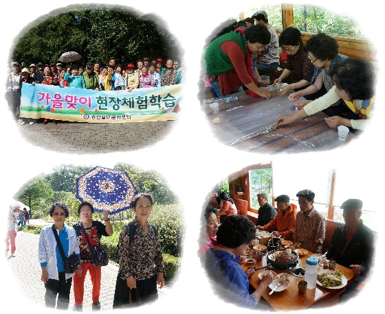 송산실버문화센터에서는 노인일자리사업과 노인맞춤형정서지원서비스사업이 연계하여 가을맞이 현장체험학습을 실시하였습니다. 이번 현장체험학습은 국립수목원에서 진행되었으며, 비누만들기 체험과 자유관람 등의 활동을 통하여 어르신들의 기분전환을 도모하고 건강하고 활기찬 여가생활이 될 수 있도록 하였습니다.