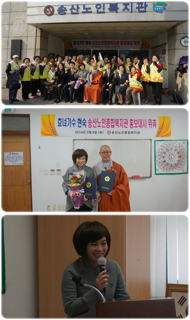 송산노인종합복지관은 지난 4일 가수 현숙을 홍보대사로 위촉하였습니다. 이날 위촉식에는 민주당 의정부 을 김민철 지역위원장, 김원기 경기도의원, 이은주 의정부시의원 등이 참여하여 축하해주셨습니다.