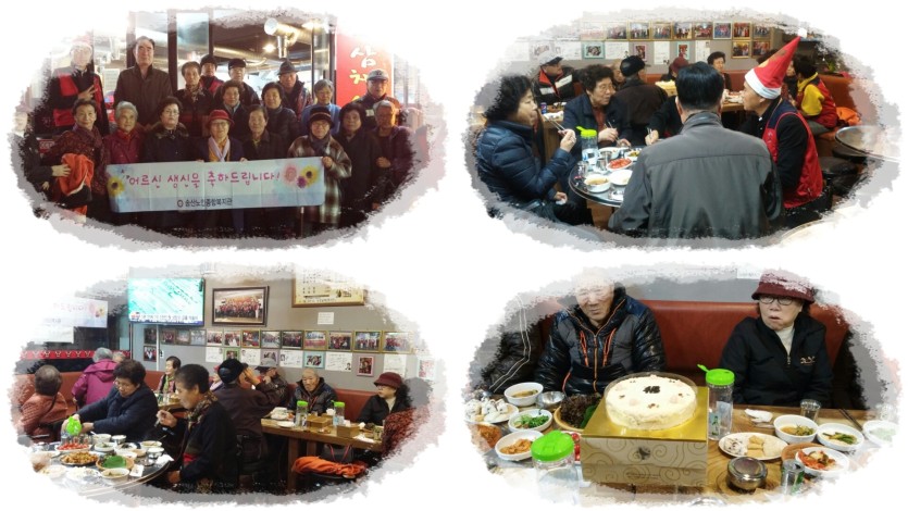 2014년 11월 27일 11월 저소득 어르신 20분을 모시고 생신잔치를 실시하였습니다. 붉은악마 봉사단과 장암동 복지위원 한규순님께 식사와 떡케익을 후원받아 제공해 드렸으며 몸이 불편하시거나 거리가 멀어 이동이 불편하신 어르신들을 대상으로 송영서비스를 실시하여 어르신 모두 생신잔치에 참석 하실 수 있었습니다. 또한 식사를 마친 후에도 송영을 통해 안전하게 귀가하실 수 있도록 하였습니다.