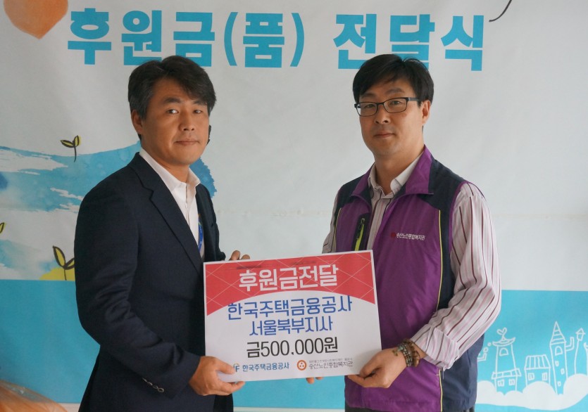 내 용 : 송산노인종합복지관에서 한국주택금융공사서울북부지사에서 후원금 500,000원을 전달 받았습니다. 의정부시 지역 어르신들과 복지관 어르신들을 위해 쓰도록 하겠습니다, ^^*