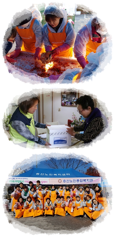 송산노인종합복지관은 11월 3일 북부청사 주차장에서 오전 9시부터 오후 3시까지 ‘2016년 KT&G와 함께하는 김장릴레이 사업’을 실시하였습니다.