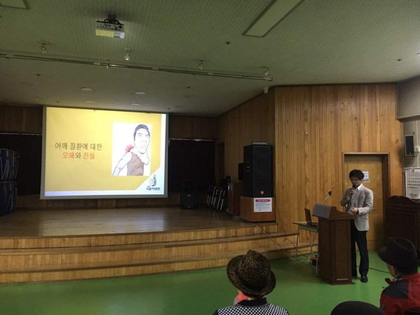 의정부 척병원과 연계 안수철 원장님을 모시고 어깨질환에 관한 설명, 증상, 예방법 및 운동법에 대한 강의를 실시하였다.