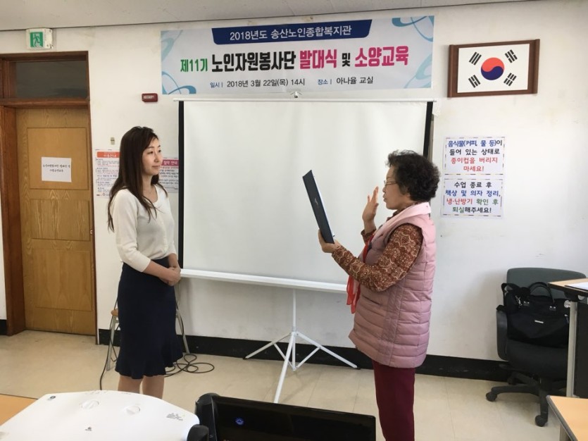 2018.3 22(목요일) 2층 아나율 교실에서 제 11기 노인자원봉사단 발대식을 실시하였습니다.