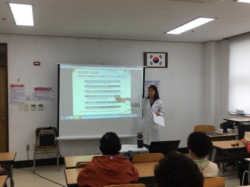 노인자원봉사단 어르신들 대상으로 예스 본 한의원 조정애 원장님을 모시고 당뇨, 고지혈증에 대한 설명, 증상, 예방법 및 운동법, 식이조절에 대한 건강교육을 실시하였다.
