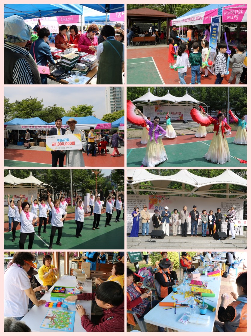 송산노인종합복지관에서는 4월 30일(화) 오전 11시부터 복지관 옆 다리목공원에서 ‘함께 걸어온 마음! 함께 걸어갈 즐거움!’을 주제로 지역주민과 함께하는 2019년 新노년문화운동 페스티벌(자비나눔축제)을 개최하였습니다.