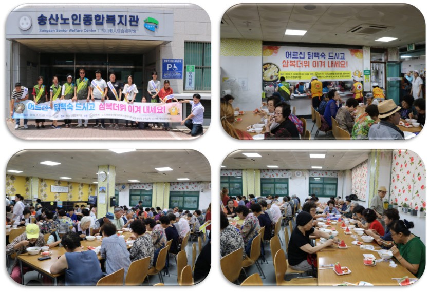 내 용 : 송산노인종합복지관(관장 최재혁)에서는 7월 12일(목) 삼복 중 첫 번째 복날인 ‘초복’을 맞아 라이프업(대표 박상은)과 사)나라환경 연합 중앙회 의정부지부, 성현 에너지, 민락포차, V.I.P 바, 영덕다이텍(주)의 후원으로 복지관 이용 어르신 500여명에게 초복 특식 나눔 행사를 진행하였다.