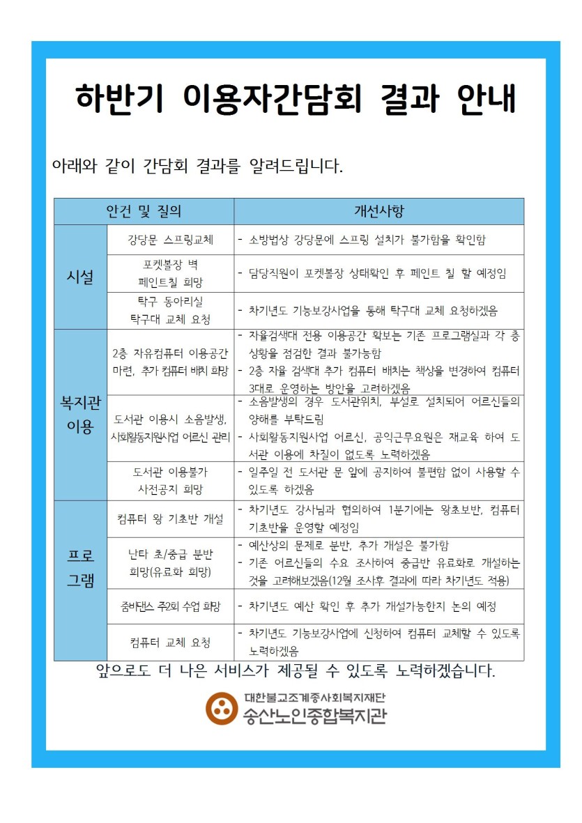 송산노인종합복지관은 어르신들의 의견을 존중하며 적극 반영하도록 더욱 노력하겠습니다.