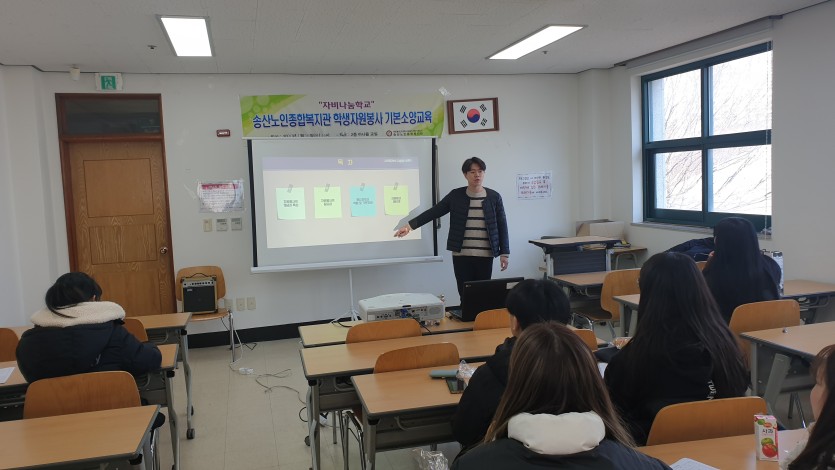 ▶ 기관안내 : 본 복지관에 자원봉사 활동을 신청한 중, 고등학생으로 송산노인종합복지관 소개 및 사업안내, 동영상 시청 등