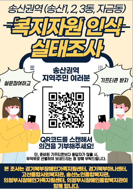 ※ 이번 송산권역 복지자원 인식 실태조사는 송산권역 실무자네트워크(경기북부장애인가족지원센터, 경기북부하나센터, 고산종합사회복지관, 송산노인종합복지관, 의정부시장애인가족지원센터, 의정부시장애인종합복지관 등 6개 기관) 주최로 진행됩니다.